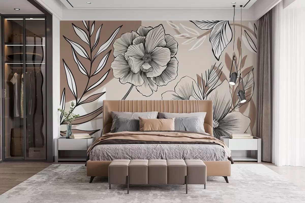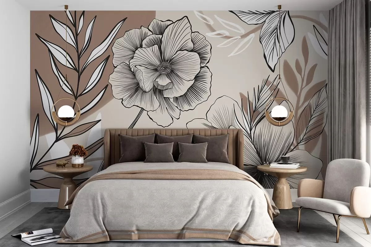 Zidne murale Veliko crno-bijelo grafičko cvijeće s detaljnim lišćem na bež apstraktnoj pozadini br. w08580