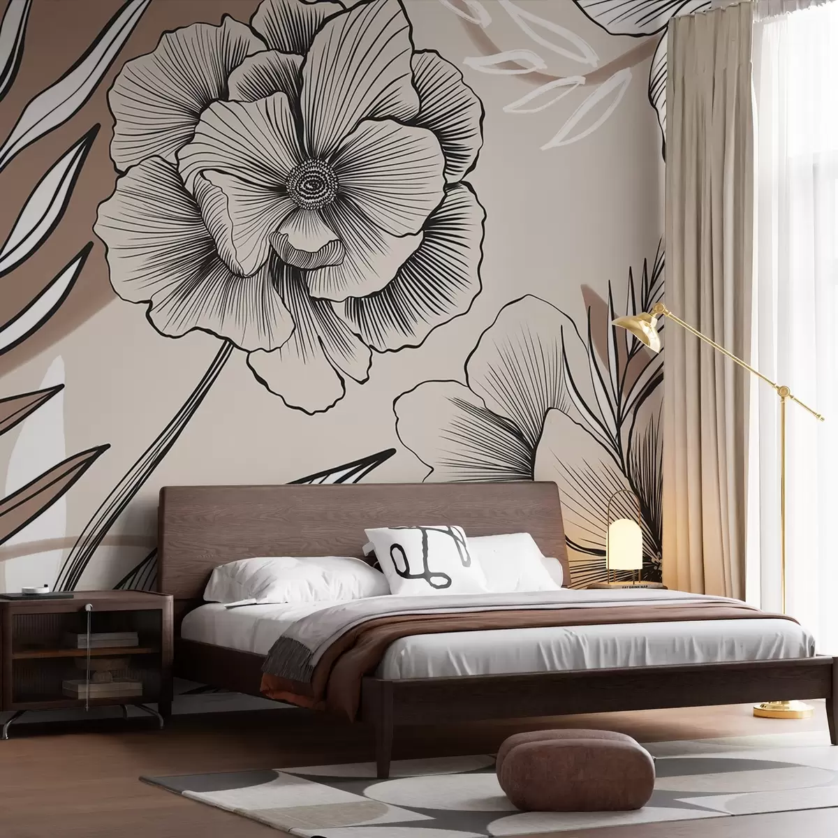 Zidne murale Veliko crno-bijelo grafičko cvijeće s detaljnim lišćem na bež apstraktnoj pozadini br. w08580
