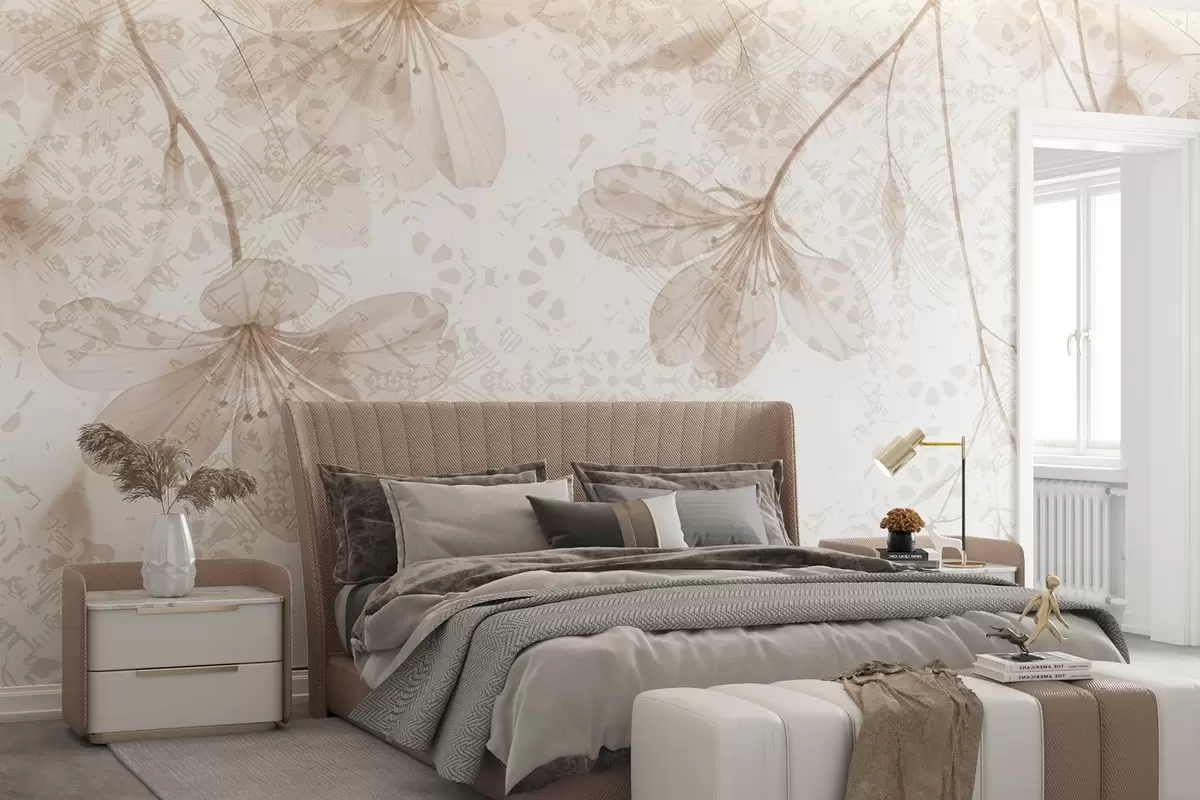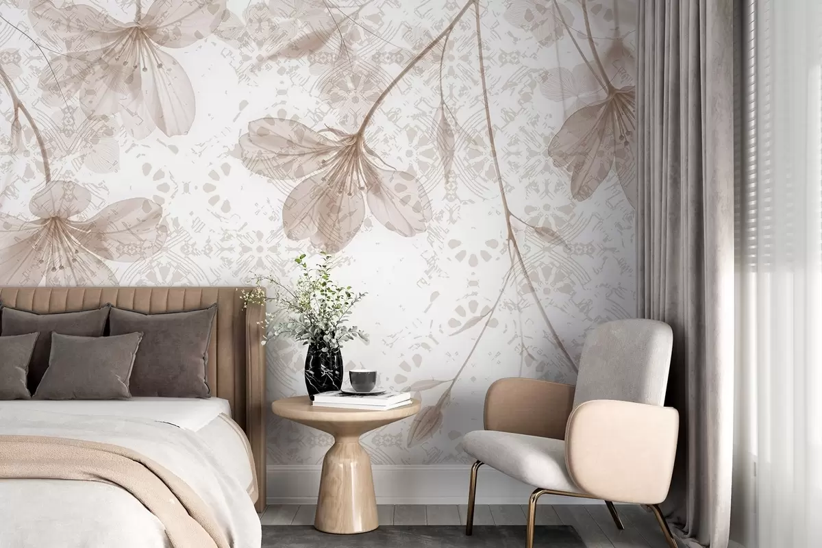 Zidne murale Nježni bež i bijeli cvjetovi s dugim peteljkama i laticama na mekoj, zamućenoj teksturalnoj pozadini br. w08588v1