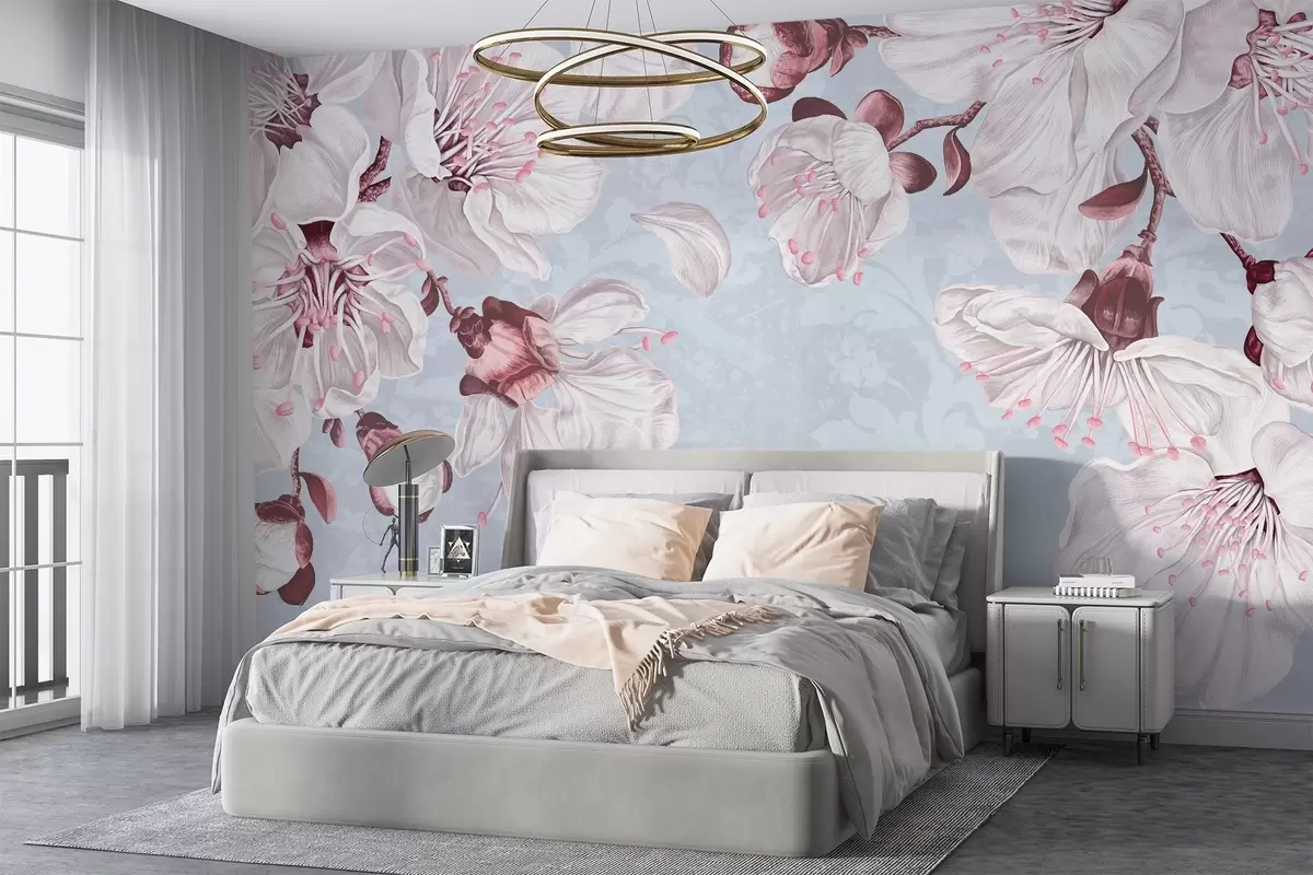 Zidne murale Cvjetni print s velikim ružičastim i bijelim cvjetovima trešnje na svijetloplavoj teksturalnoj pozadini br. w08601