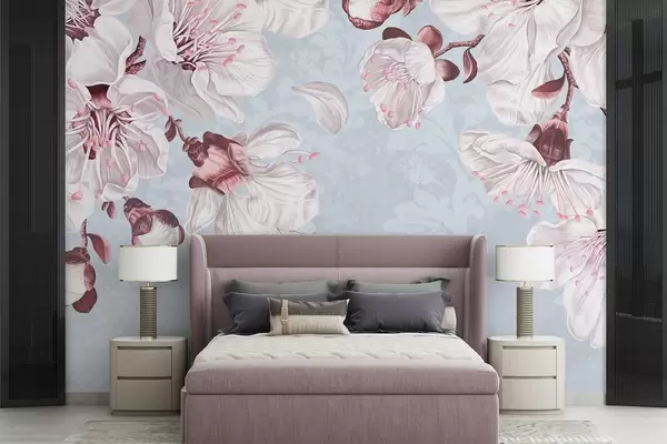 Zidne murale Cvjetni print s velikim ružičastim i bijelim cvjetovima trešnje na svijetloplavoj teksturalnoj pozadini br. w08601