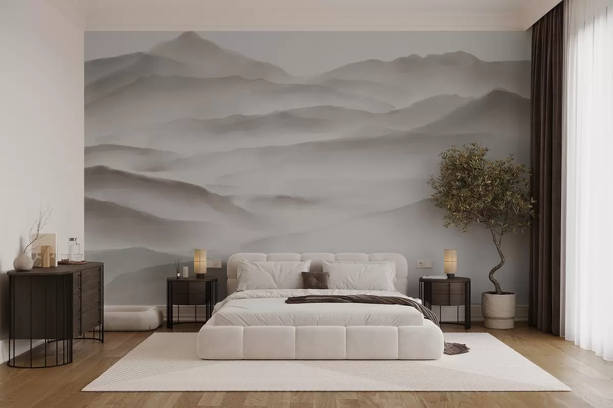Zidne murale Minimalistički planinski krajolik s valovitim brežuljcima i maglom stvara spokojan i atmosferičan ispis br. w08602