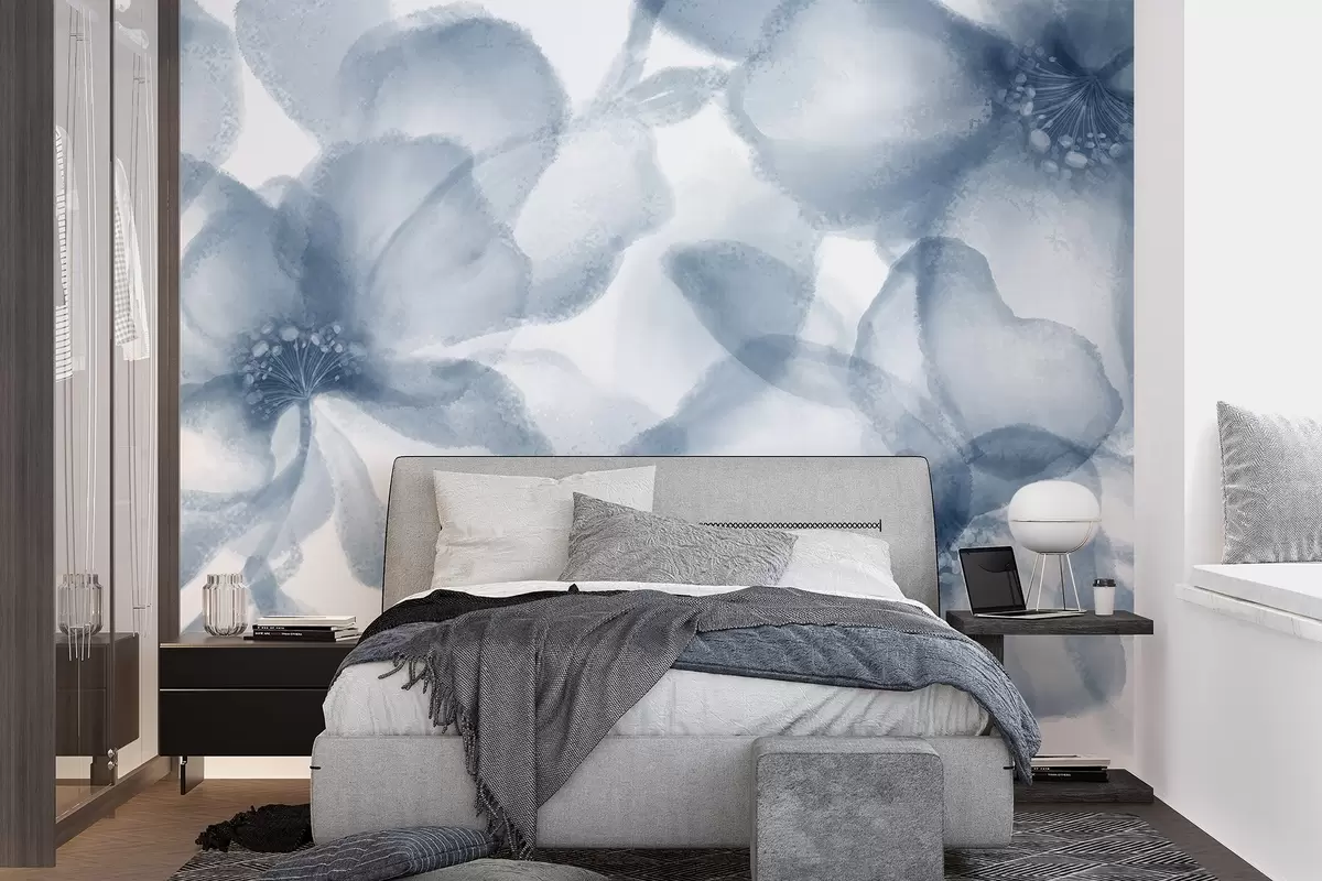 Zidne murale Nježni, zamućeni apstraktni plavi cvjetovi stvaraju spokojan i umirujući cvjetni print br. w08607