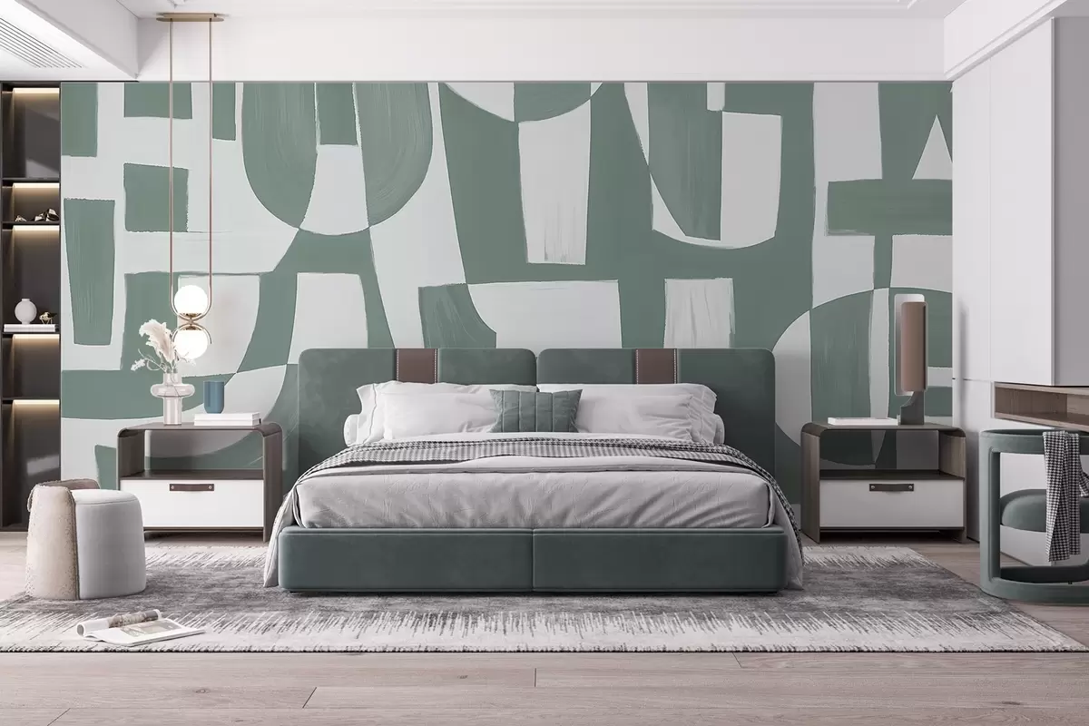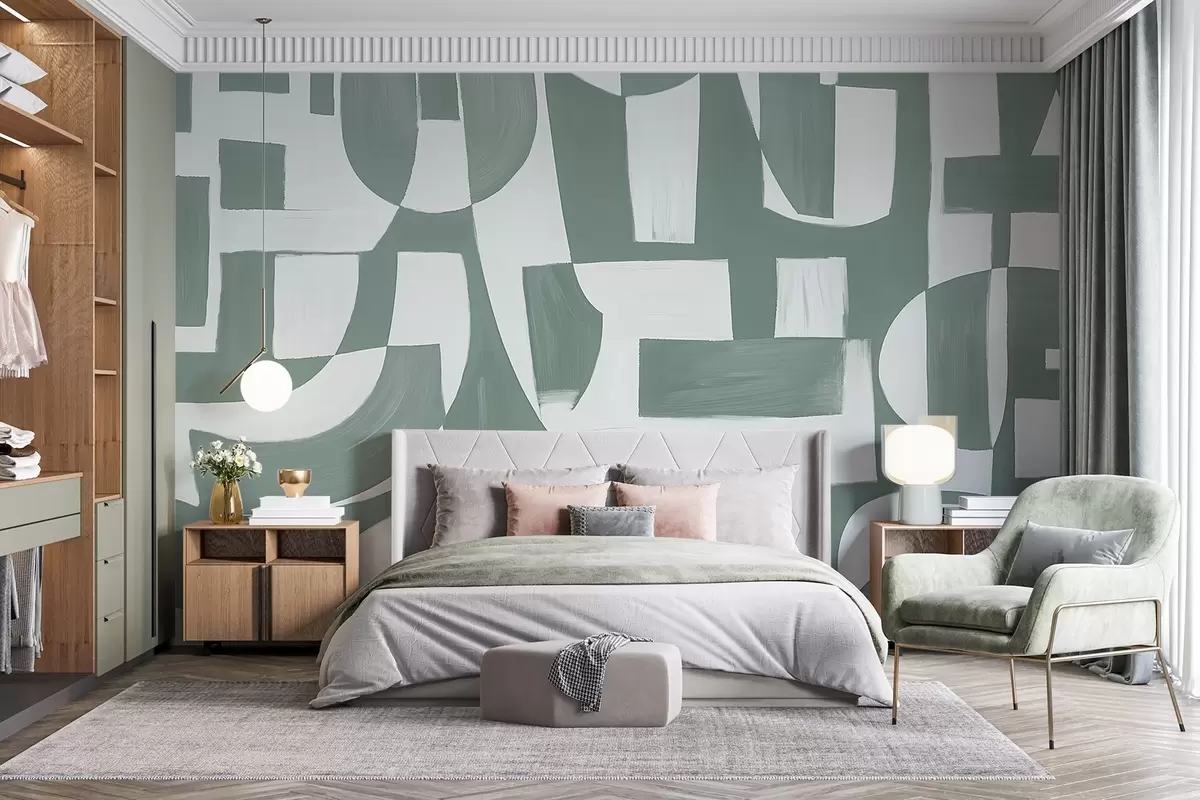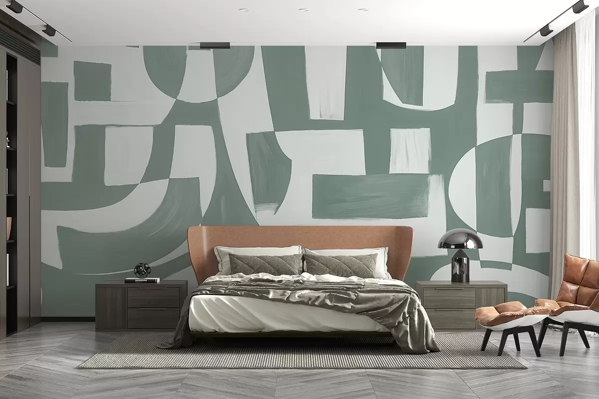Zidne murale Apstraktni zeleni i bijeli geometrijski oblici i uzorci stvaraju vizualno upečatljivu i dinamičnu kompoziciju br. w08608v1