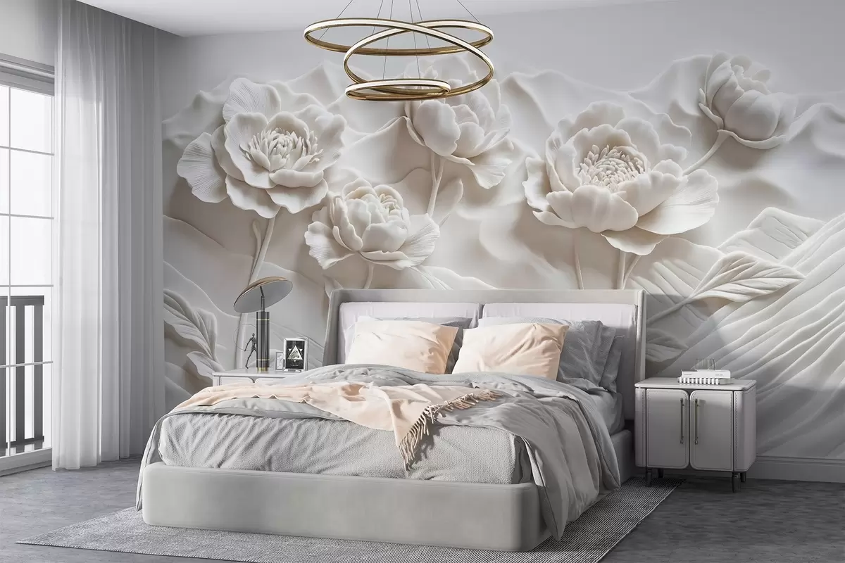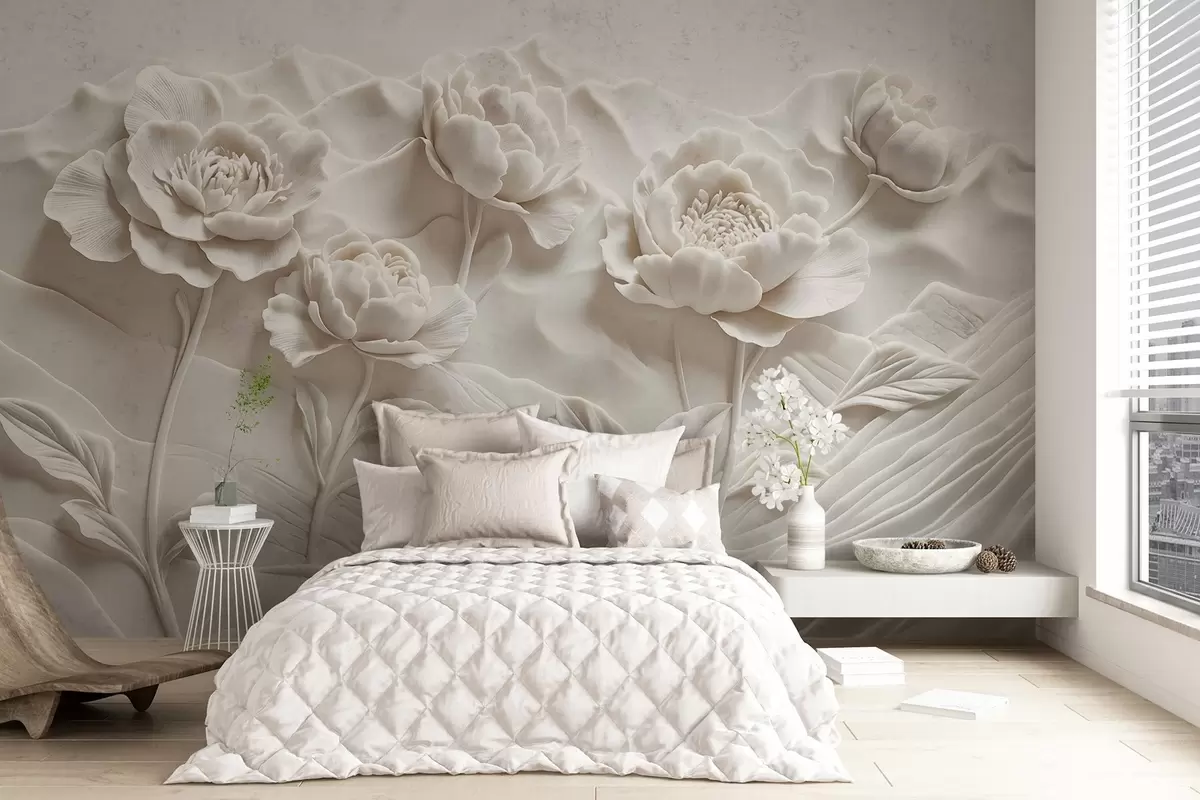 Zidne murale Bijela cvjetna imitacija reljefne skulpture s velikim, detaljnim cvjetovima božura na jednostavnoj pozadini br. w08612