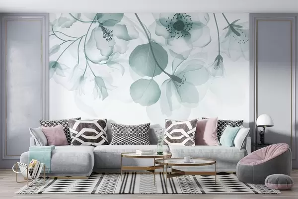 Zidne murale Nježno prigušeno tirkizno prozirno cvijeće s mekim laticama i tamnim središtem, na svijetloj pozadini br. w08613v1