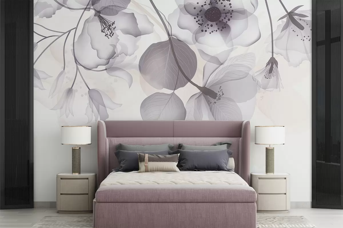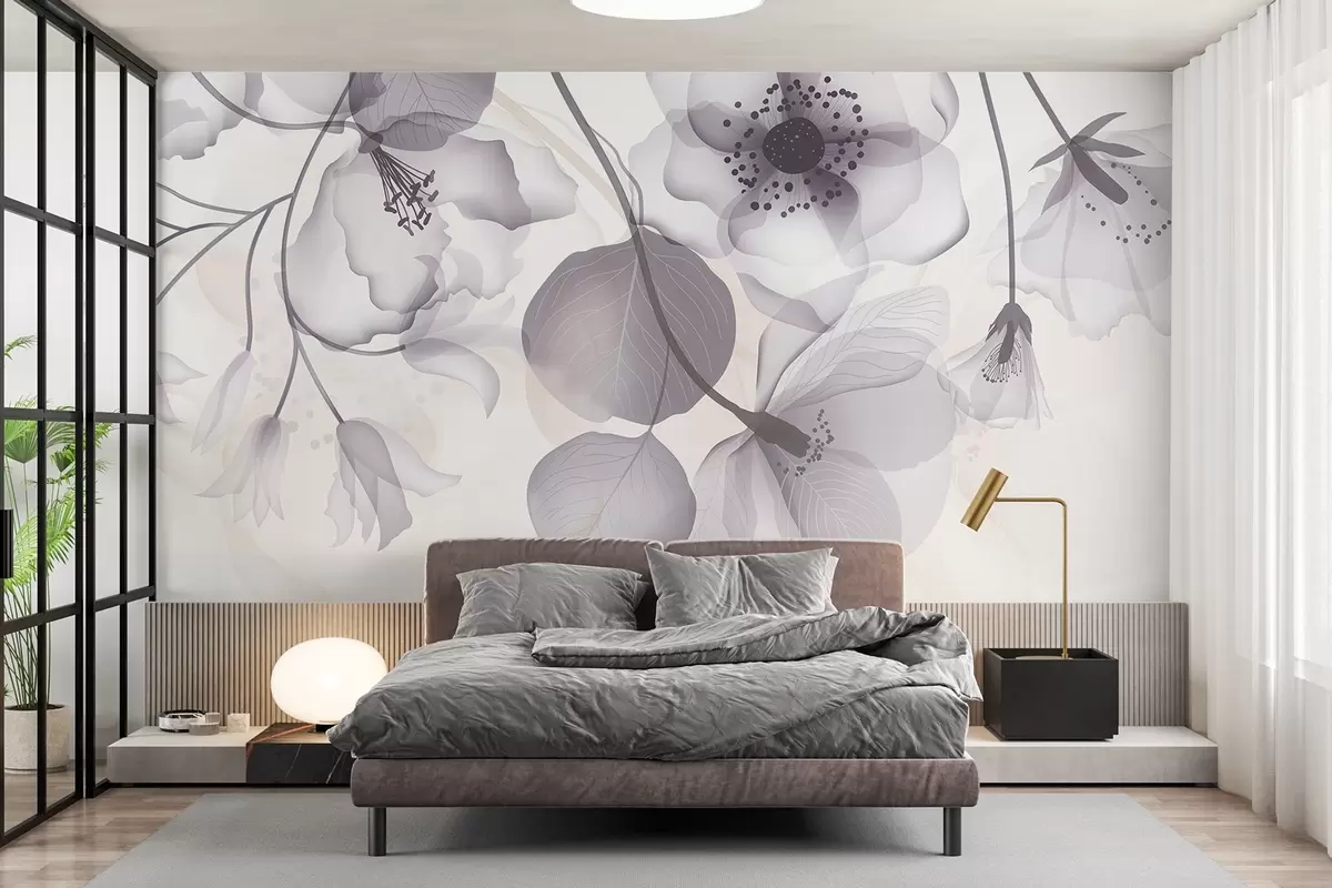Zidne murale Nježno sivo i bež prozirno cvijeće s mekim laticama i tamnim središtem, na svijetloj pozadini br. w08613v2