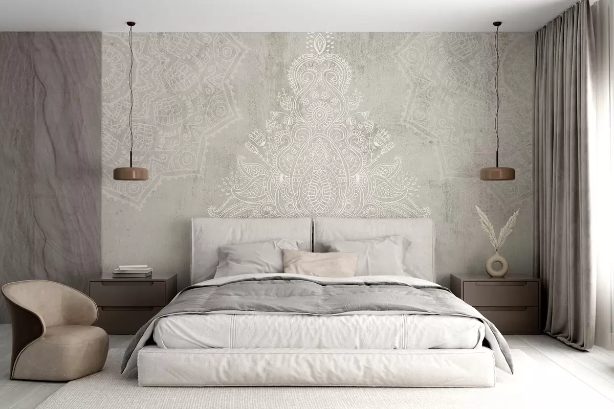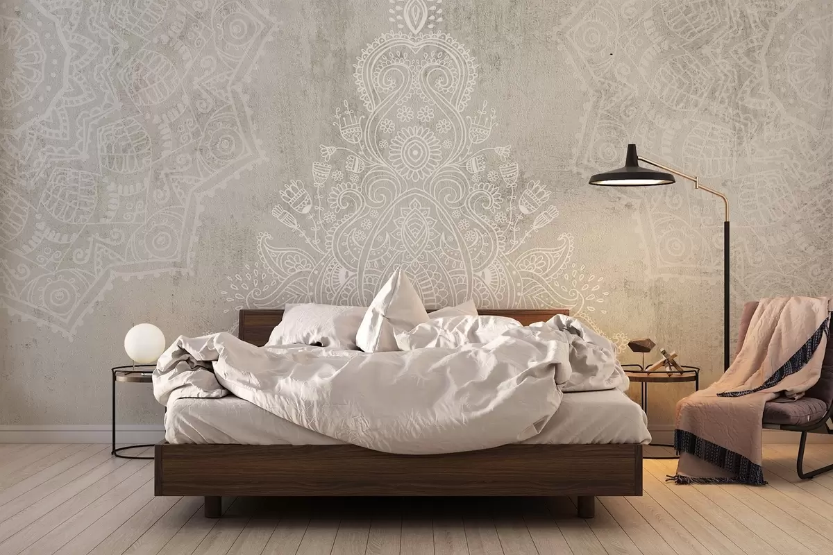 Zidne murale Detaljan, zamršen otisak mandale od bijele čipke na svijetlo bež teksturiranoj apstraktnoj pozadini br. w08614
