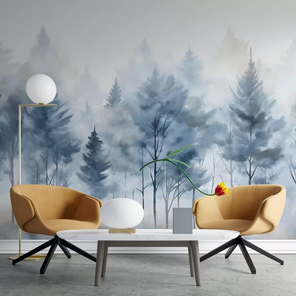 Zidne murale Magloviti šumski krajolik s visokim borovima i golim listopadnim stablima u prvom planu imitacije akvarela br. w08643