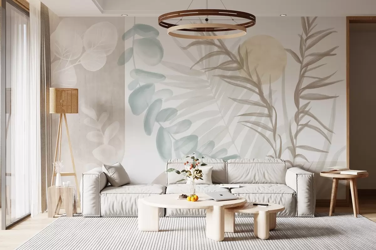 Zidne murale Minimalistički apstraktni print sa stiliziranim lišćem i eukaliptusom s mekim, bež organskim oblicima u prigušenim pastelnim bojama br. w08648