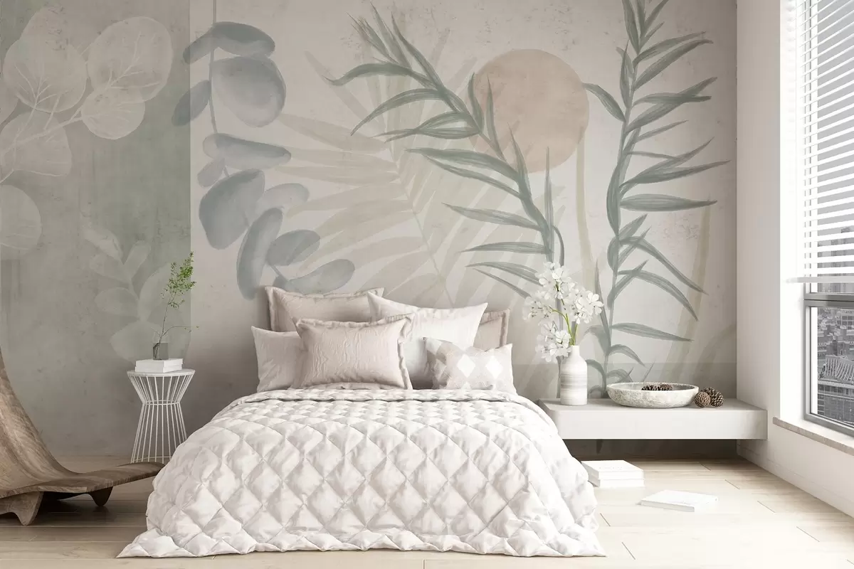 zidne murale Minimalistički apstraktni print sa stiliziranim lišćem i eukaliptusom s mekim, plavim organskim oblicima u prigušenim pastelnim bojama w08648v1