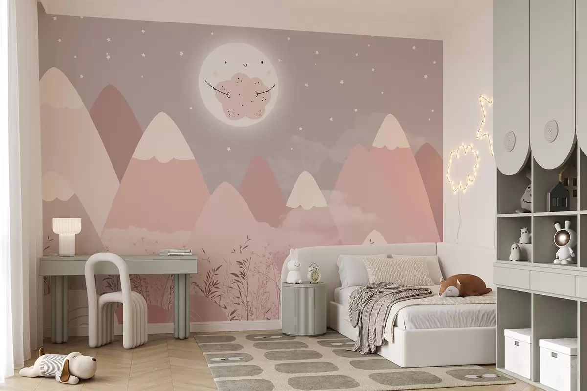 Zidne murale Dječje planine sa slatkim mjesecom i biljkama na dnu br. w08659