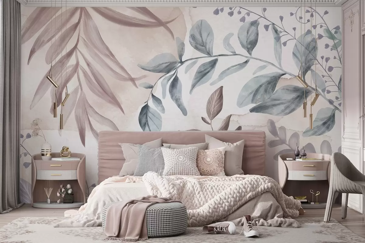 Zidne murale Botanički print s lišćem i cvjetnim granama u nježnim pastelnim bojama, na podlozi poput akvarela br. w08668