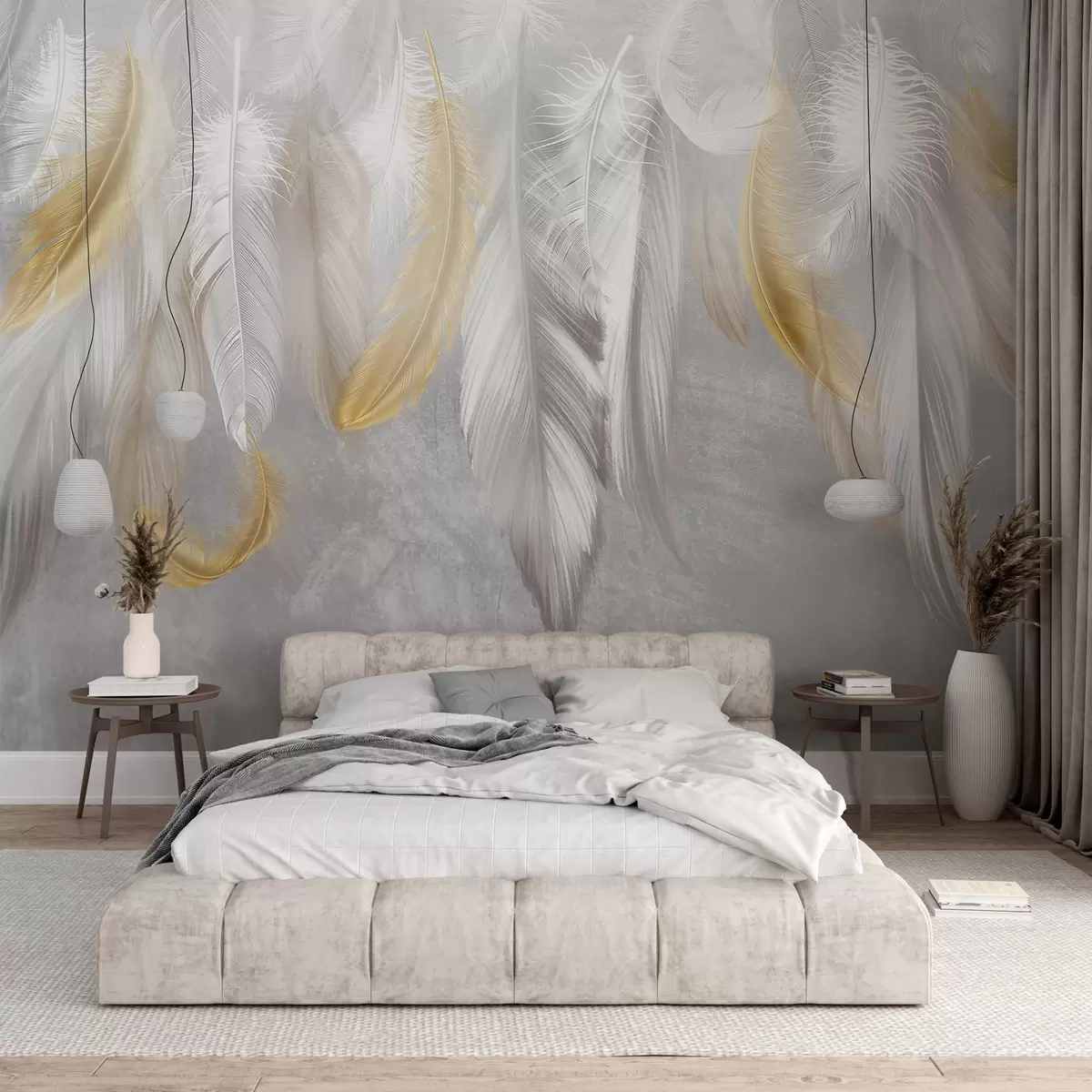 Zidne murale Bijelo i žuto perje koje visi na mekoj sivoj pozadini, stvarajući nježnu i prozračnu kompoziciju br. w08670