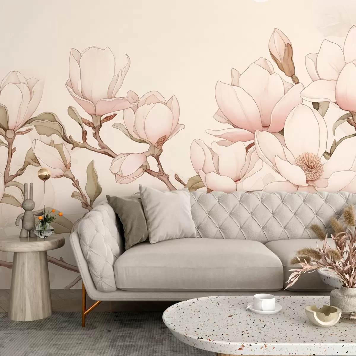 Zidne murale Grane magnolije s nježnim ružičastim cvjetovima na svijetloj pozadini stvaraju sofisticiranu i mirnu atmosferu br. w08688