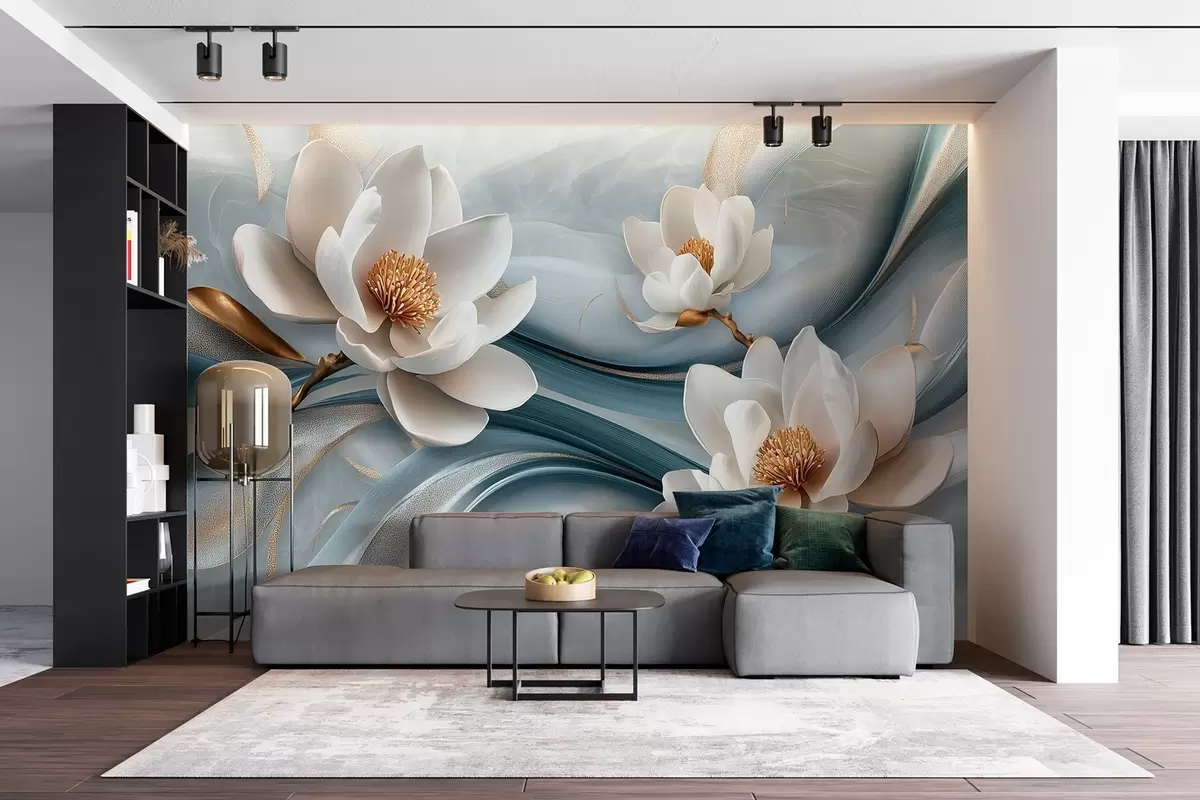 zidne murale Cvjetovi magnolije u kombinaciji s plavim, bijelim i žutim tonovima s apstraktnim valovima w08695