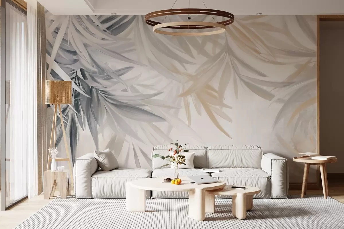 zidne murale Mekano, tekuće svijetlo tropsko lišće u nijansama sive i breskve, stapa se u blijed, neutralan otisak w08703
