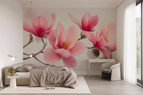 Zidne murale Ružičasta proljetna magnolija cvjeta u stilu akvarela na svijetlosivoj pozadini br. w08709
