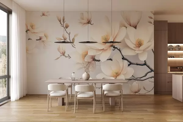 Zidne murale Prekrasni cvjetovi magnolije krem boje na bijeloj pozadini br. w08721