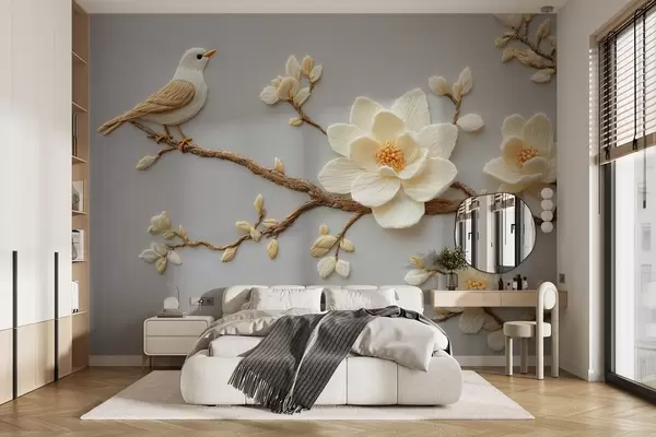Zidne murale U stilu izvezenih cvjetova magnolije s pticom na grani na svijetloplavoj pozadini br. w08724