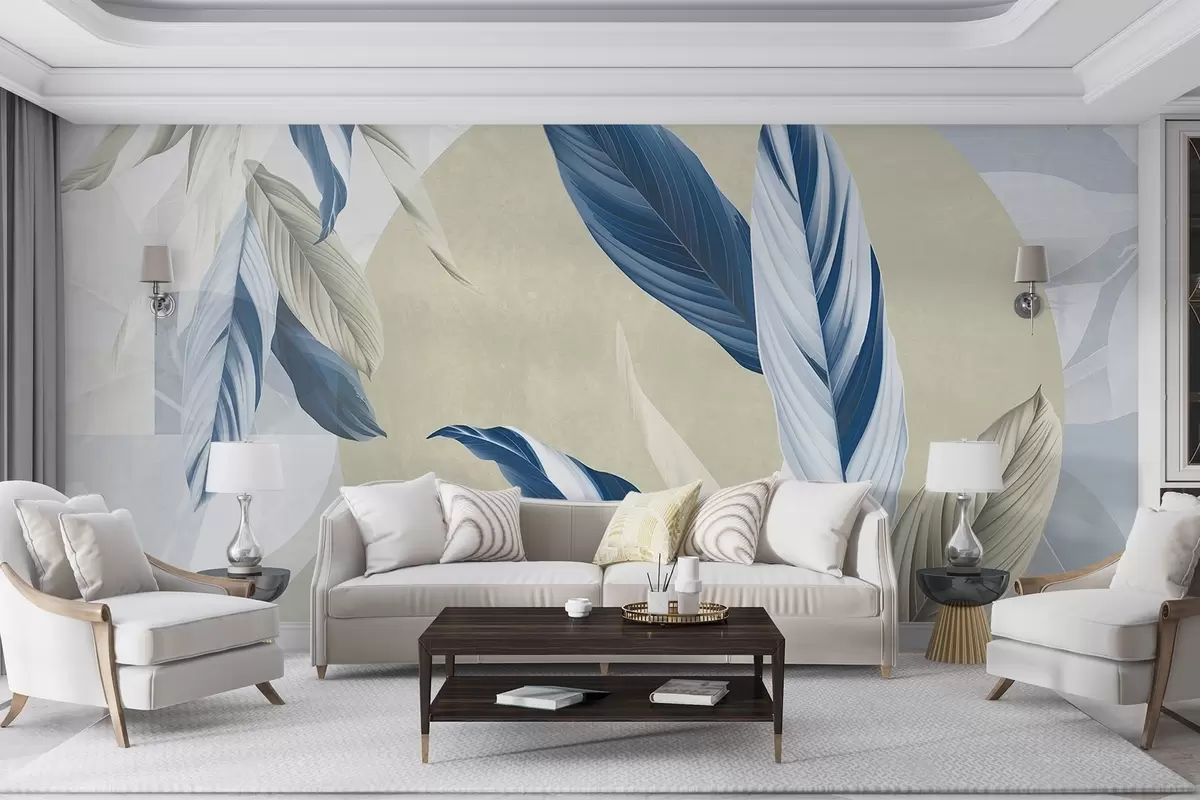 Zidne murale Moderna i apstraktna geometrijska teksturna kompozicija s detaljnim listovima u nijansama plave, bež i bijele br. w08741