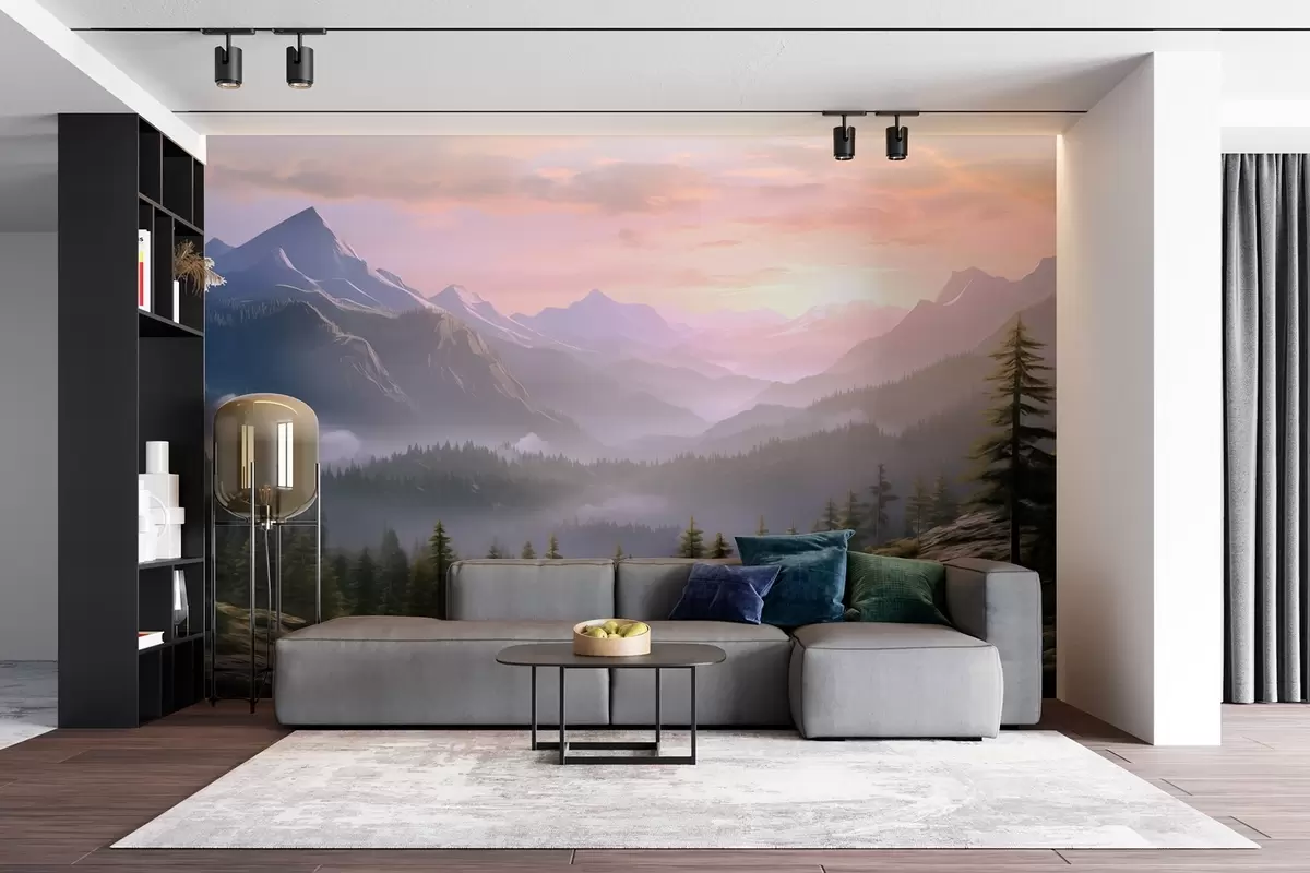 zidne murale Miran planinski krajolik u zoru s mekom maglom na pozadini šume w08750