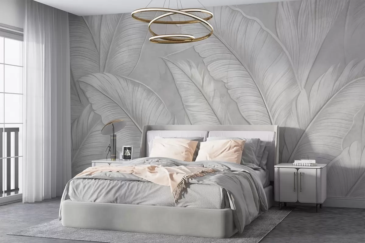 zidne murale Veliko tropsko lišće s visokom teksturom u monokromatskoj svijetlo sivoj boji u stilu potkrovlja  w08772