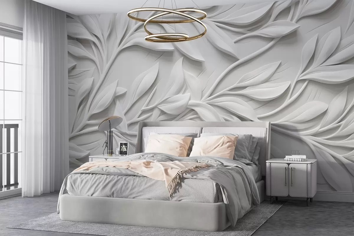 Zidne murale Bijeli teksturirani ispis s lišćem i granama stvara efekt voluminozne imitacije na teksturiranoj pozadini br. w08778