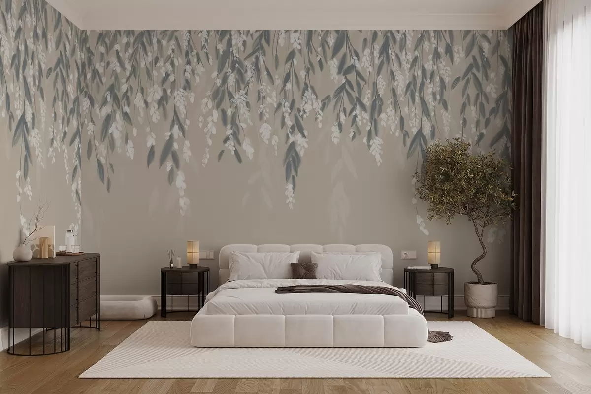 Zidne murale Kaskadno grane lišća u nijansama prigušene zelene s bijelim cvjetovima i lišćem na bež pozadini br. w08781