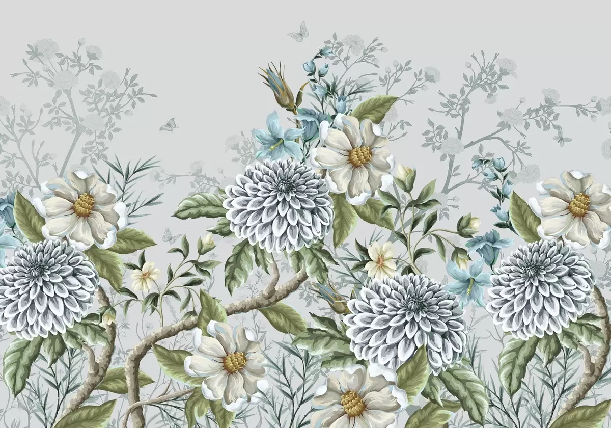 Zidne murale Cvjetni print s krizantemama, nježnim plavim cvjetovima i zelenim lišćem isprepletenim granama br. w08782