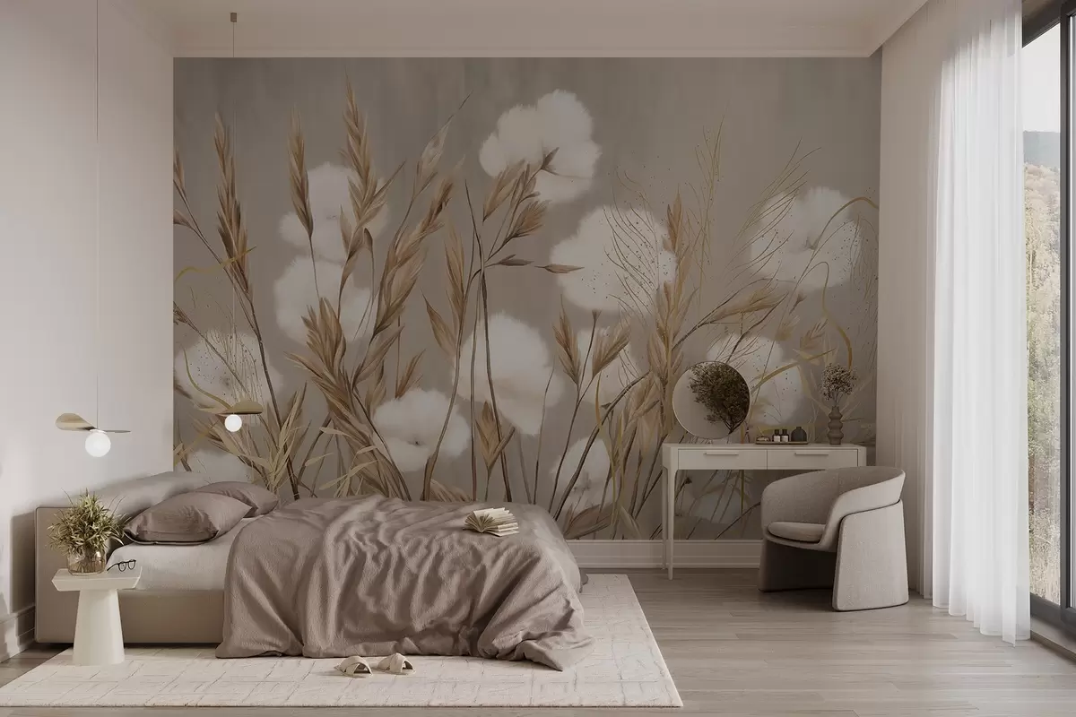 Zidne murale Mekano, pahuljasto pamučno bijelo cvijeće i visoki narančasti klasići trave na prigušenoj teksturiranoj bež pozadini br. w08784