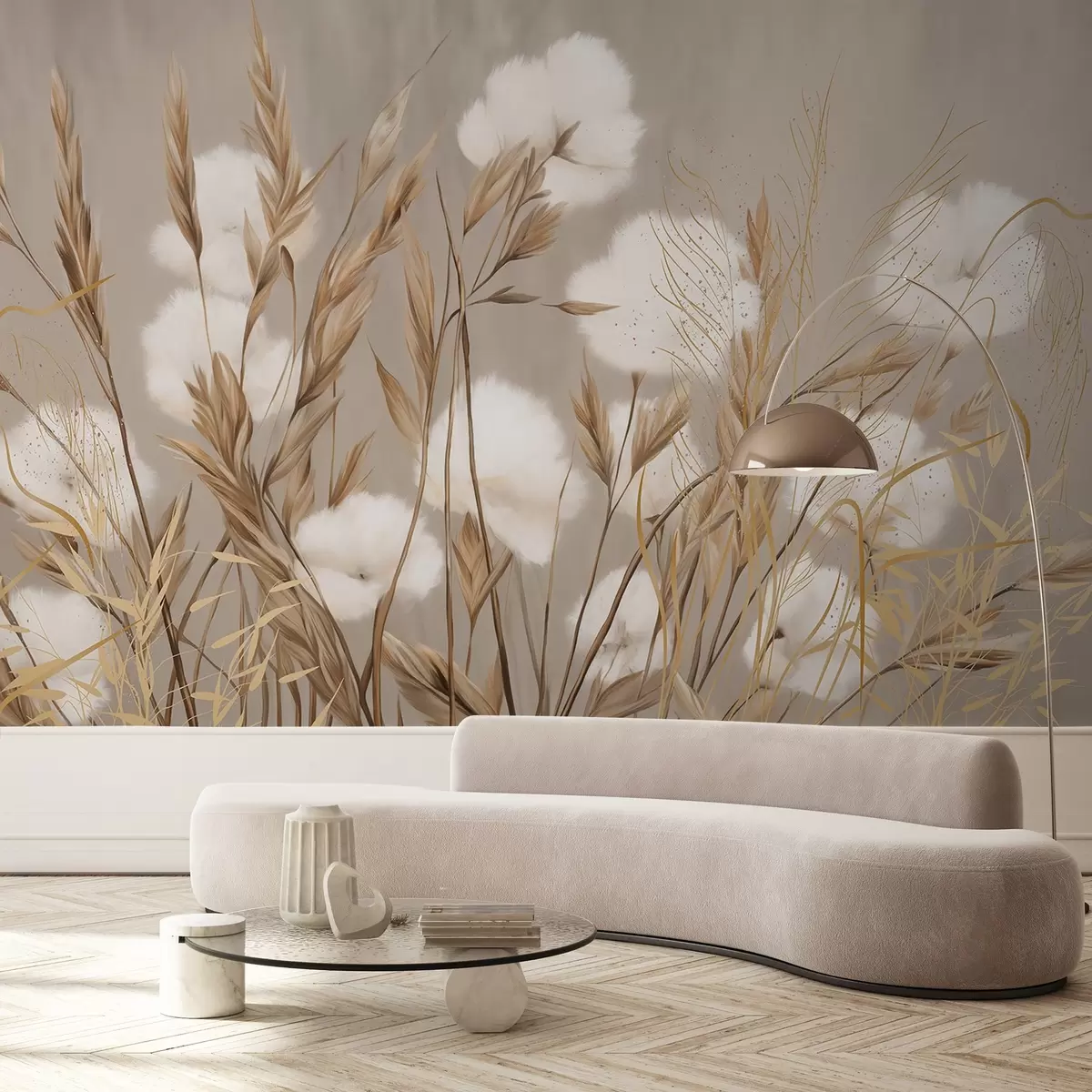 Zidne murale Mekano, pahuljasto pamučno bijelo cvijeće i visoki narančasti klasići trave na prigušenoj teksturiranoj bež pozadini br. w08784
