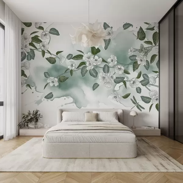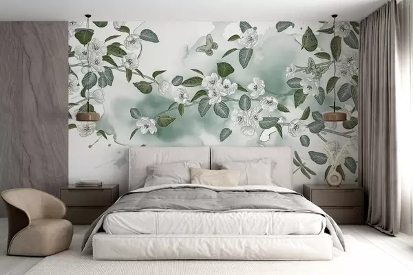 Zidne murale Grana trešnjinog cvijeta s cvijećem, lišćem, leptirima na svijetlozelenoj pozadini s akvarelnom teksturom br. w08831