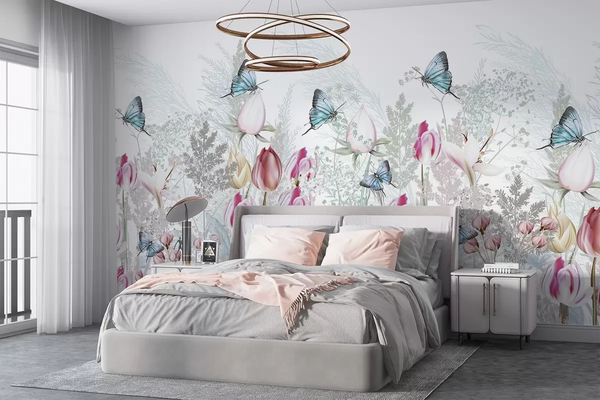 Zidne murale Pastelni otisak s cvjetovima tulipana, travom i leptirima koji lete u vrtu br. w08834