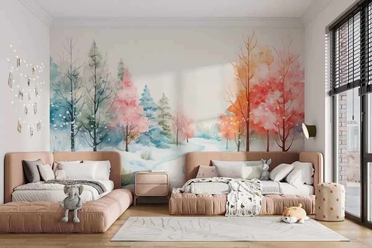 Zidne murale Živahna zimska šuma u stilu akvarela br. w08856