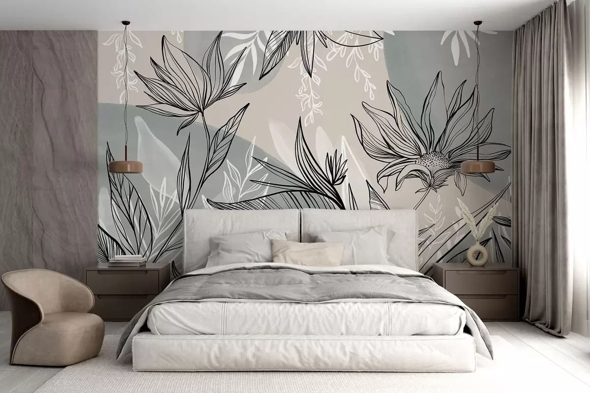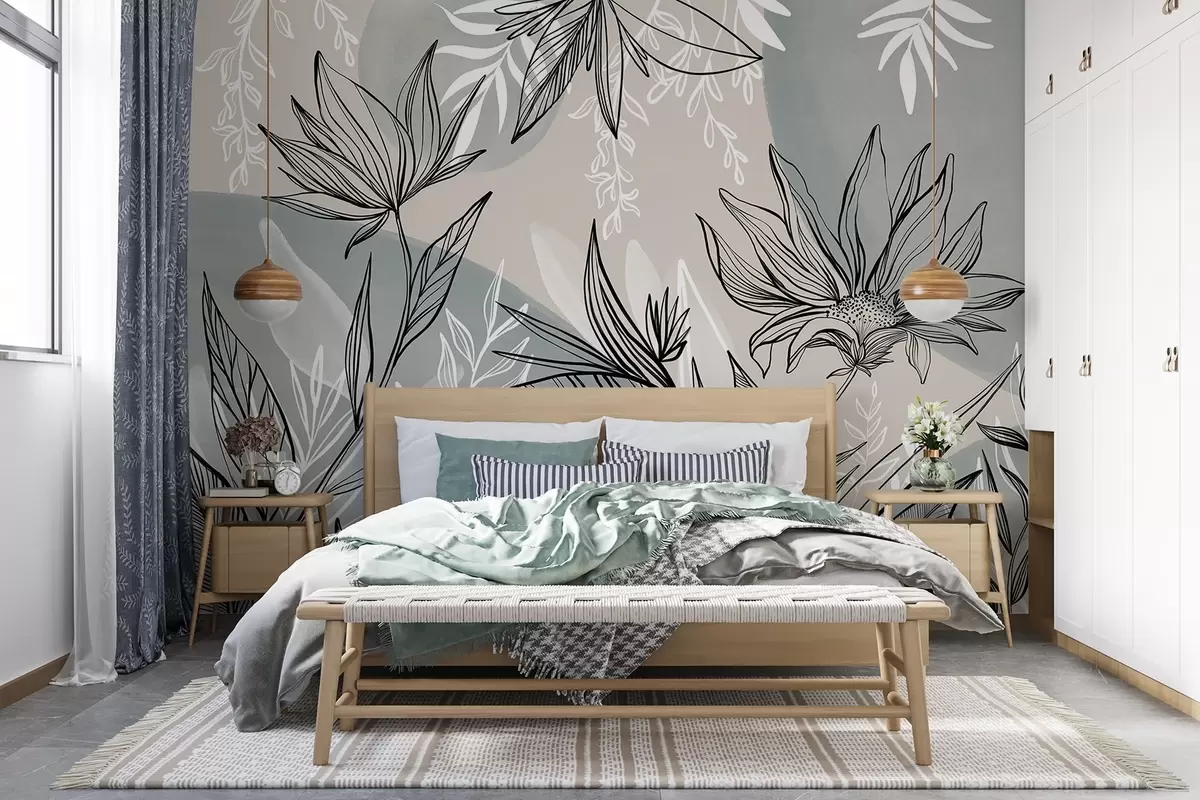 Zidne murale Cvjetni crtež s velikim lišćem i cvijećem, na pozadini bež i plavih akvarela br. w08865