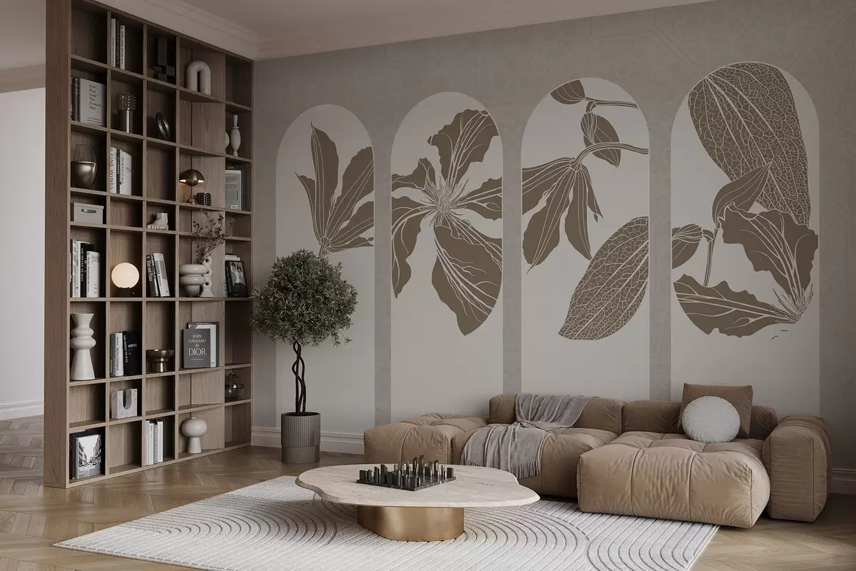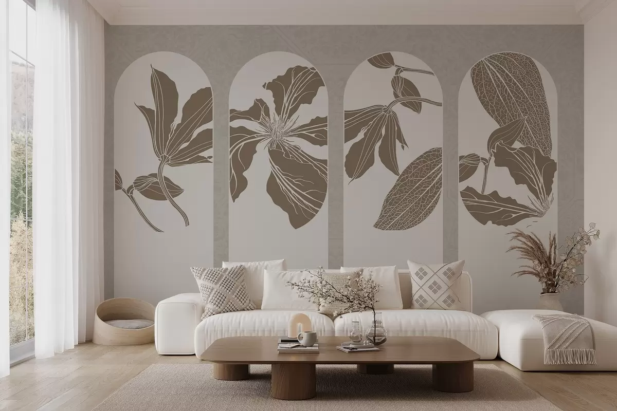 Zidne murale Elegantni lukovi s cvjetnim motivima u bež i bijeloj boji, na teksturiranoj bež pozadini, minimalistički stil br. w08866
