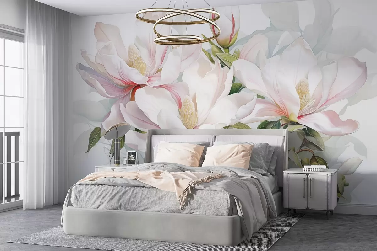 zidne murale Cvjetovi magnolije s bijelim i ružičastim laticama, lišćem i smeđim granama, mekani i delikatni stil akvarela w08885