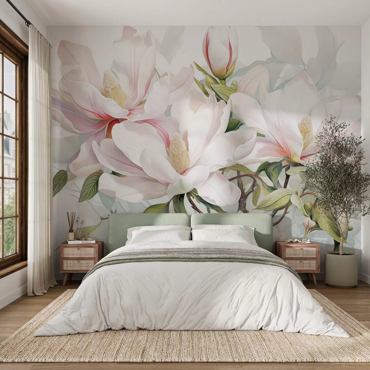 Zidne murale Cvjetovi magnolije s bijelim i ružičastim laticama, lišćem i smeđim granama, mekani i delikatni stil akvarela br. w08885