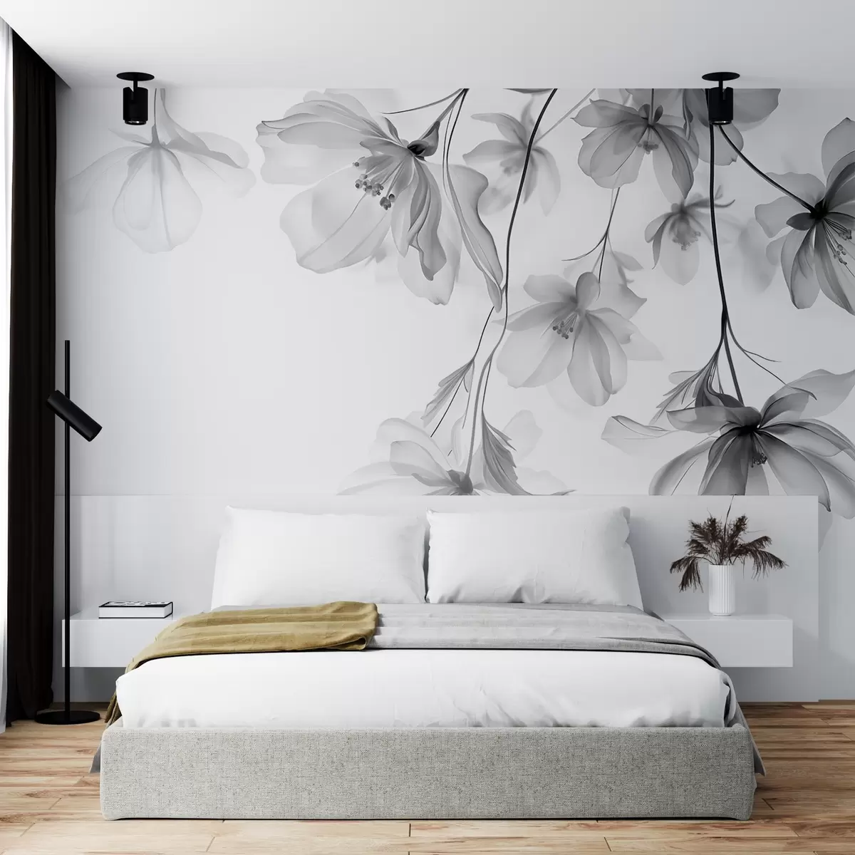 Zidne murale Crno cvijeće s prozirnim laticama koje vise s grane, crno-bijelo, minimalistička moderna umjetnička kompozicija br. w08911