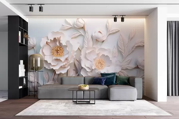 Zidne murale 3D reljefni božuri u fresko stilu sa žutim akcentom br. w08967