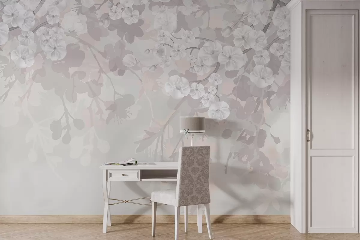 Zidne murale Grane trešnjinog cvijeta s bijelim cvjetovima i sivim lišćem, na elegantnim cvjetnim siluetama u nježnim pastelnim bojama br. w08973v1