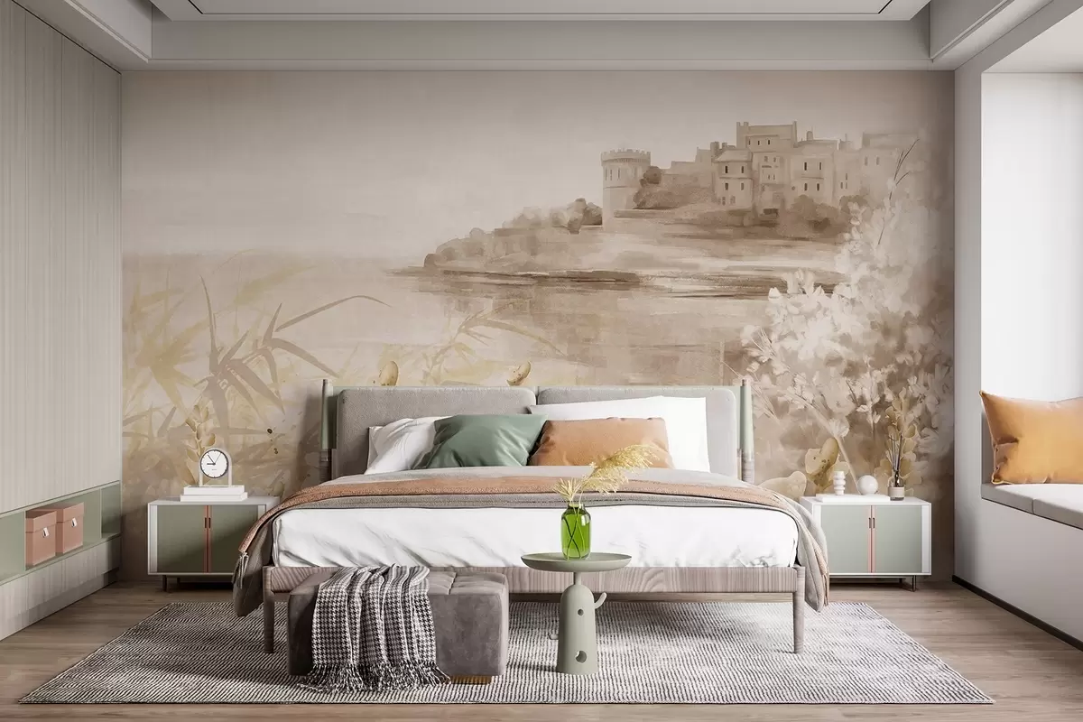 Zidne murale Teksturirani starinski krajolik s dvorcem na litici s pogledom na more, s cvjetovima lavande u prigušenim bojama br. w08975v1