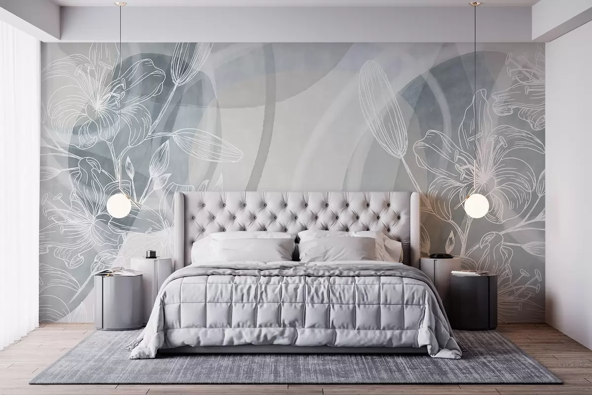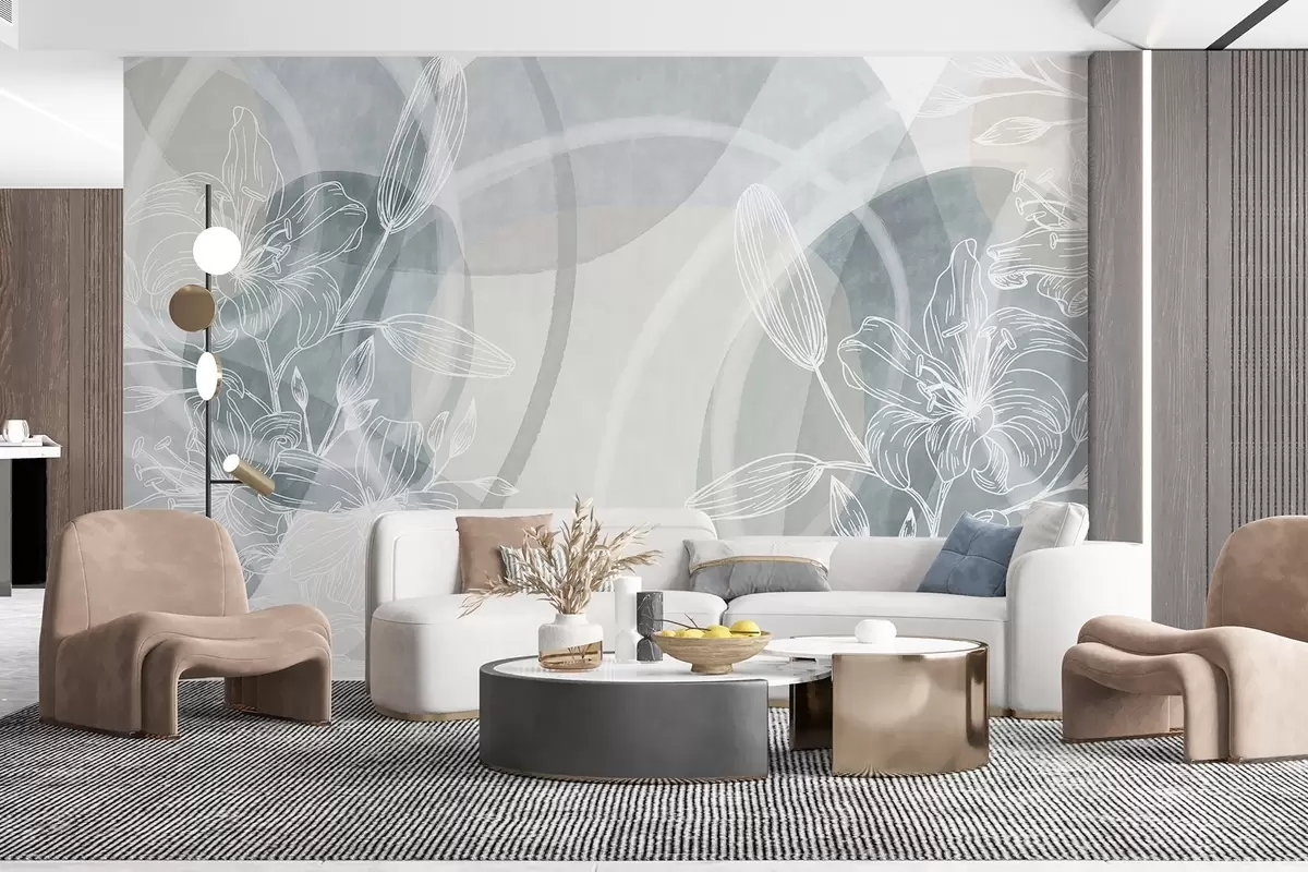 Zidne murale Minimalistički cvjetni dizajn s bijelim crtanim cvijećem i lišćem, preklapajući apstraktni krugovi u nijansama sive i plave br. w08979