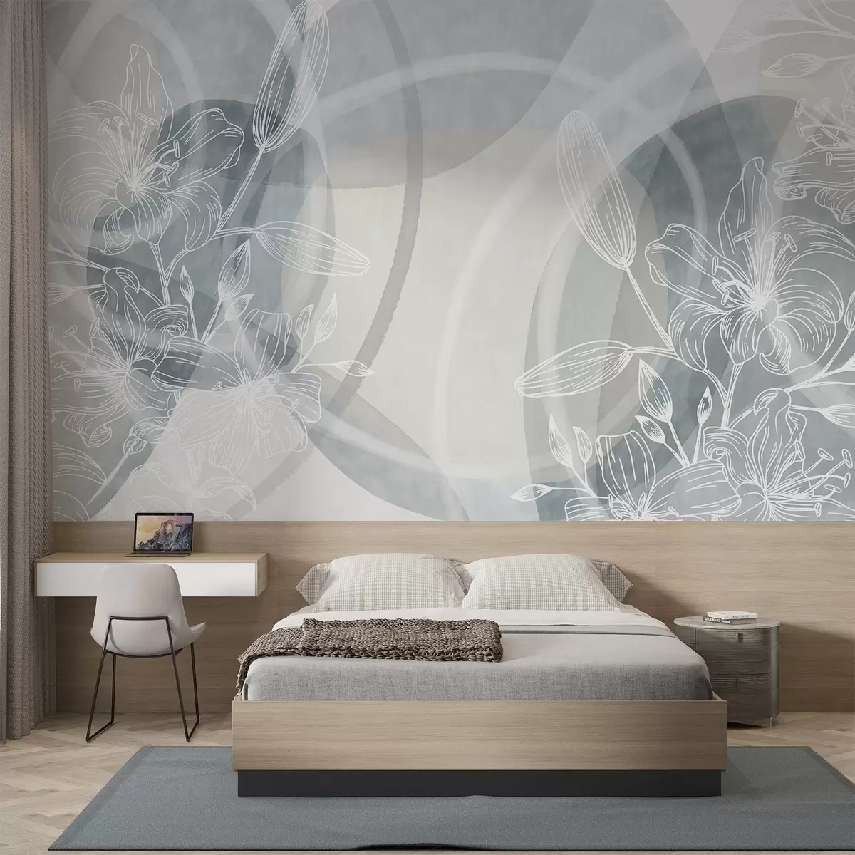 Zidne murale Minimalistički cvjetni dizajn s bijelim crtanim cvijećem i lišćem, preklapajući apstraktni krugovi u nijansama sive i plave br. w08979