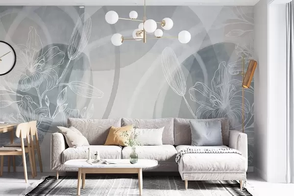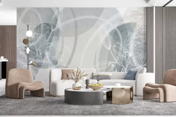 Zidne murale Minimalistički cvjetni dizajn s bijelim crtanim cvijećem i lišćem, preklapajući apstraktni krugovi u nijansama sive i plave br. w08979