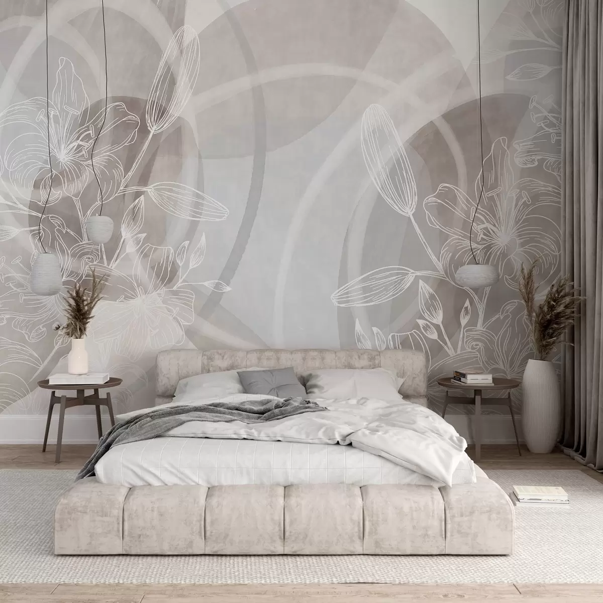 Zidne murale Minimalistički cvjetni dizajn s bijelim linijskim umjetničkim cvijećem i lišćem, preklapajućim apstraktnim krugovima u nijansama bež i plave br. w08979v1