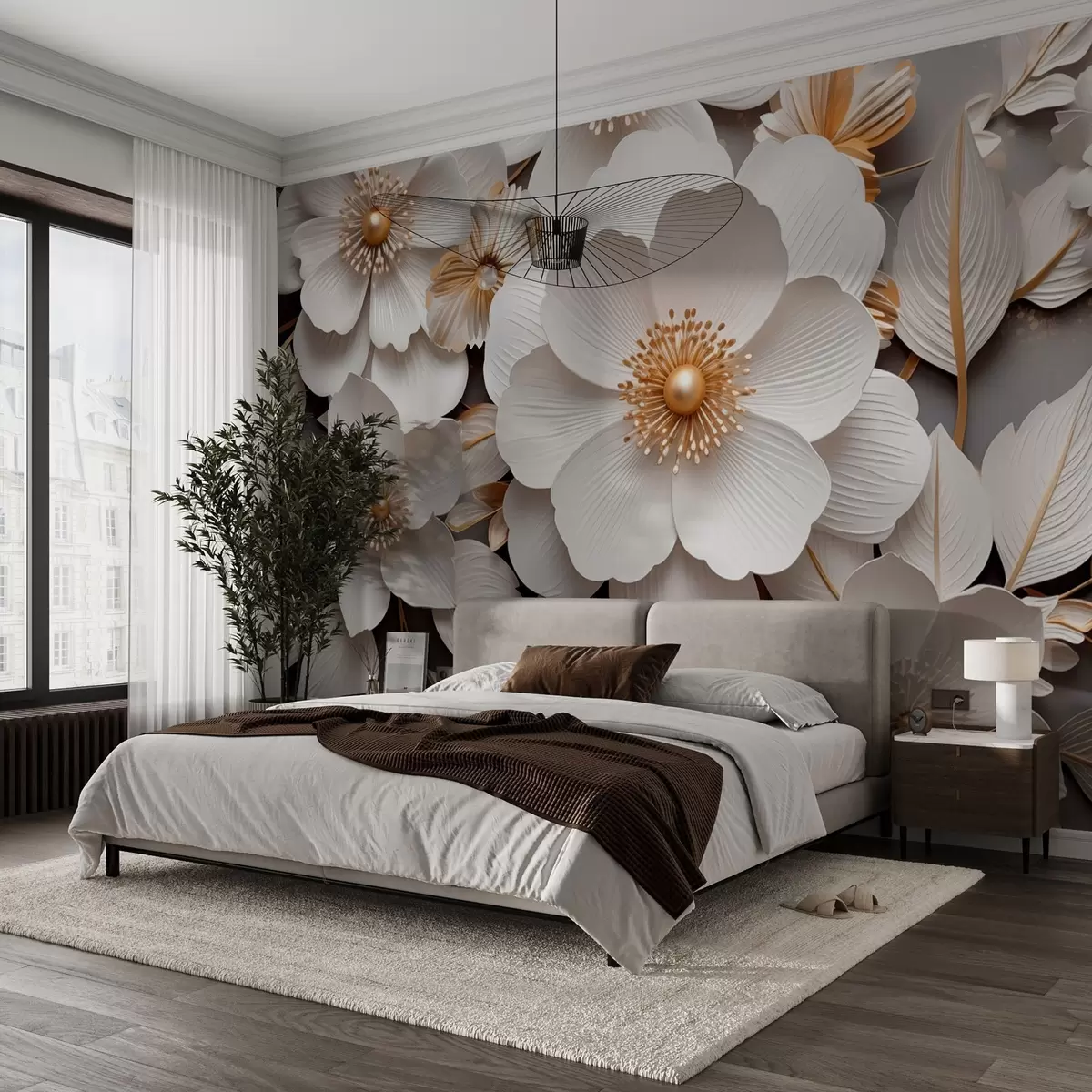 zidne murale 3D cvijeće u origami stilu u žuto-sivim tonovima w08993