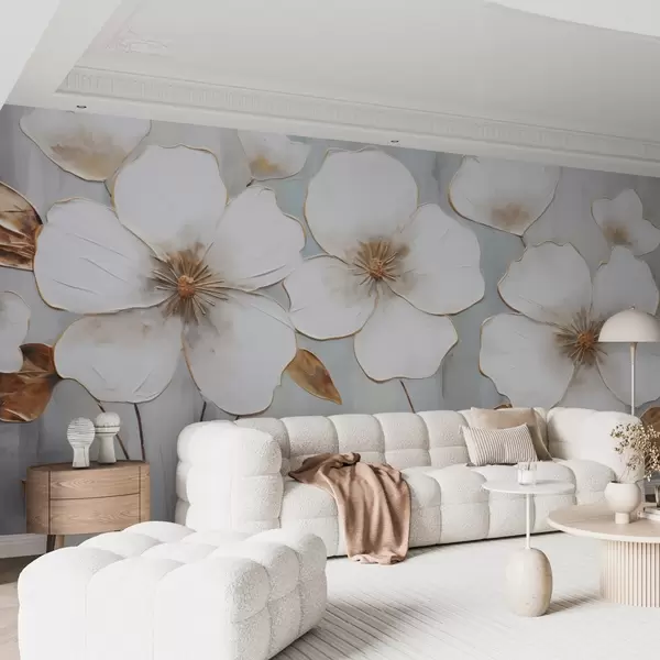 zidne murale Veliki bijeli cvjetovi sa žutim listovima na sivoj pozadini w08999