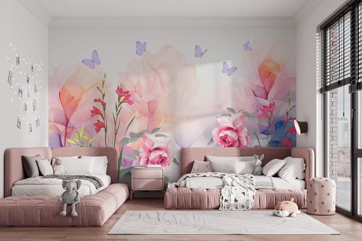 Zidne murale Cvijeće s leptirima i ružama u stilu akvarela br. w09002